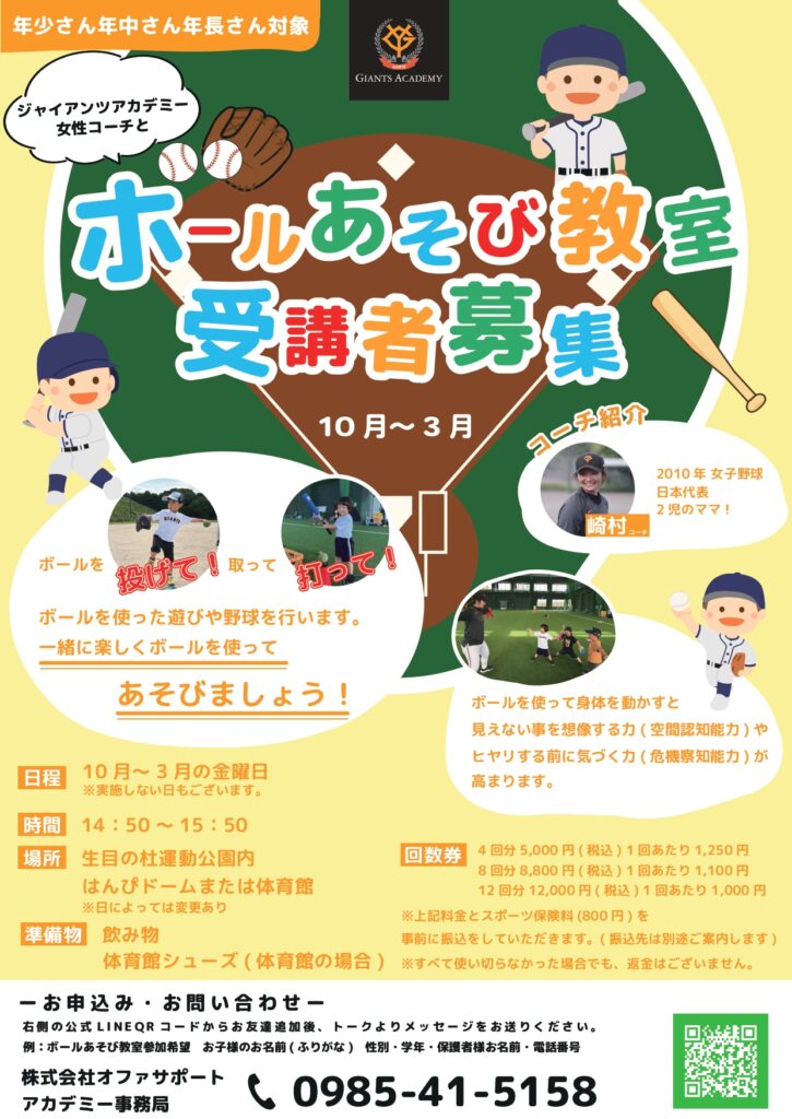 普段のジャイアンツアカデミーのスクールとは少し違う、幼児対象のボール遊び教室を10月~3月の期間限定で開催したします!